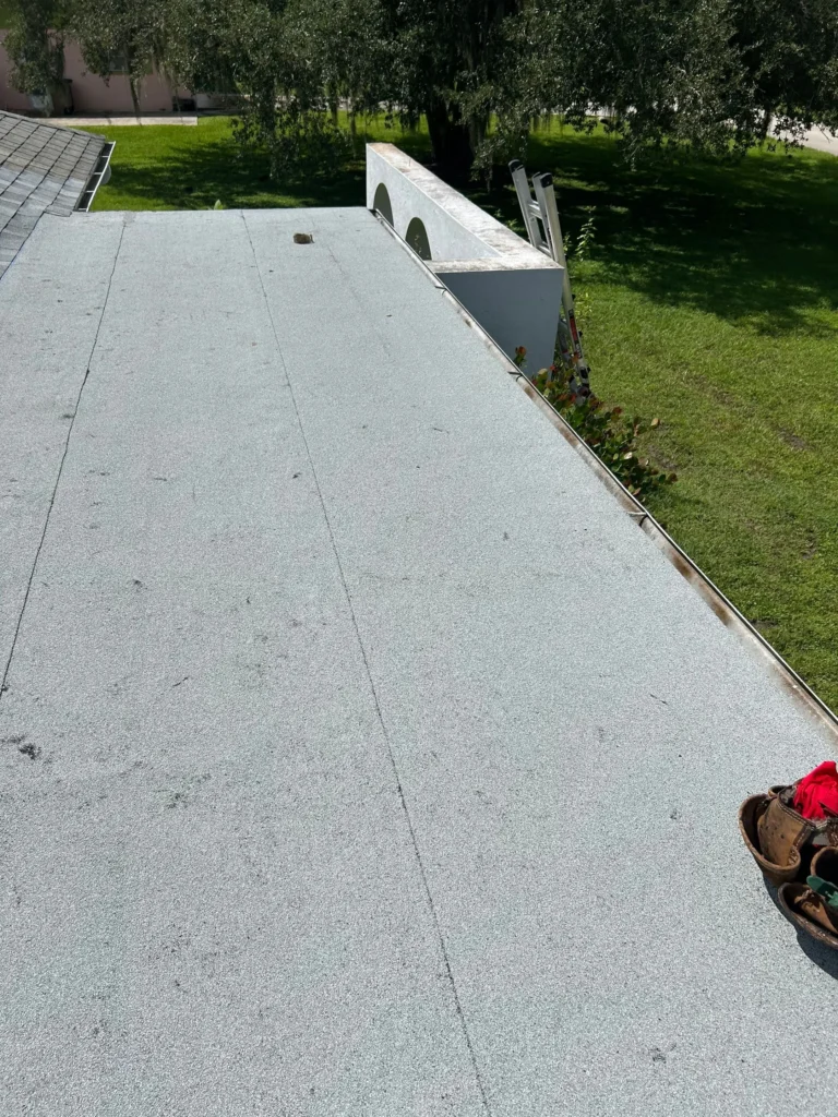 Front porch re-roof in North Fort Myers. Patio was pooling water and leaking due to insufficient slope. Removed roof, installed tapered insulation to provide slope and direct water off roof, and then put a new modified granulated cap sheet. Materials have 20-year material warranties.
